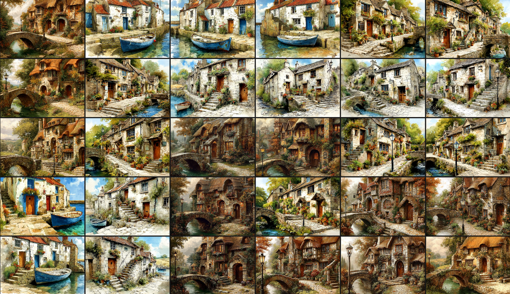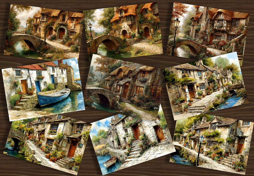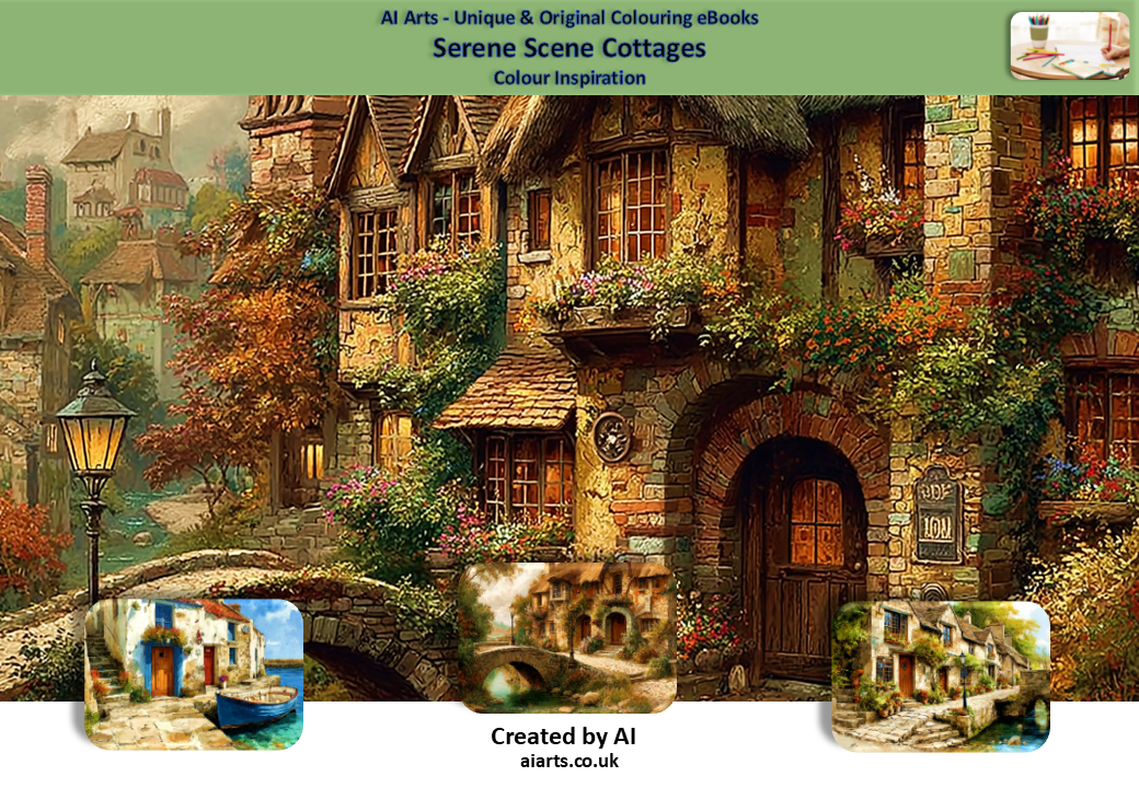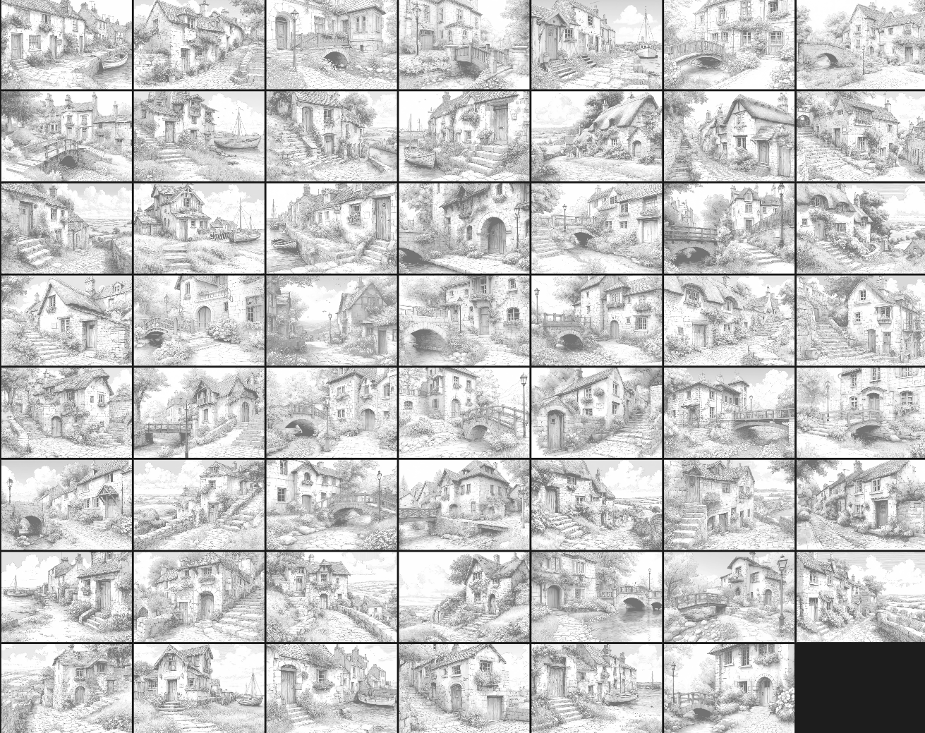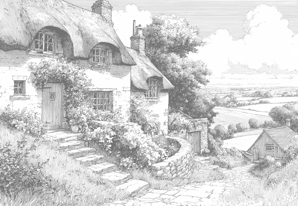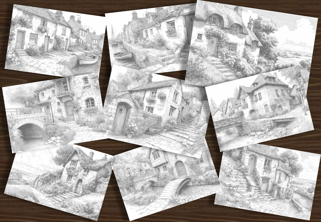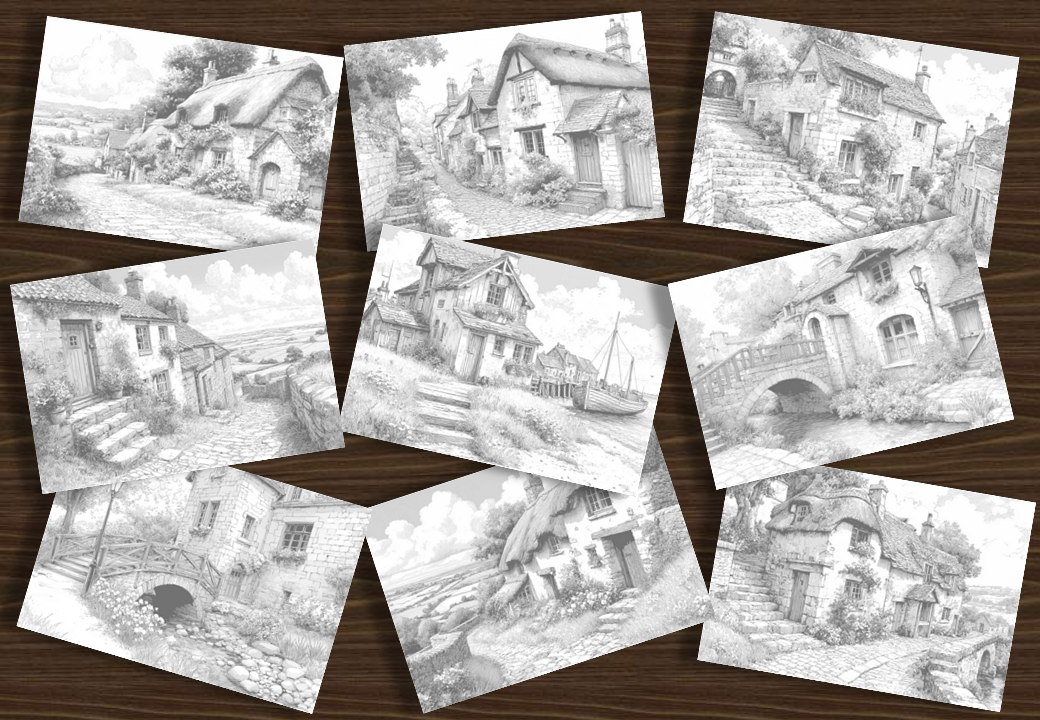 Intricate line-art scenes of cosy cottages, bridges, fisherman cottages, thatched cottages, quaint hillside village cottages, blooming gardens, hills and fields, and tranquil scenery. Single-sided designs for easy printing.