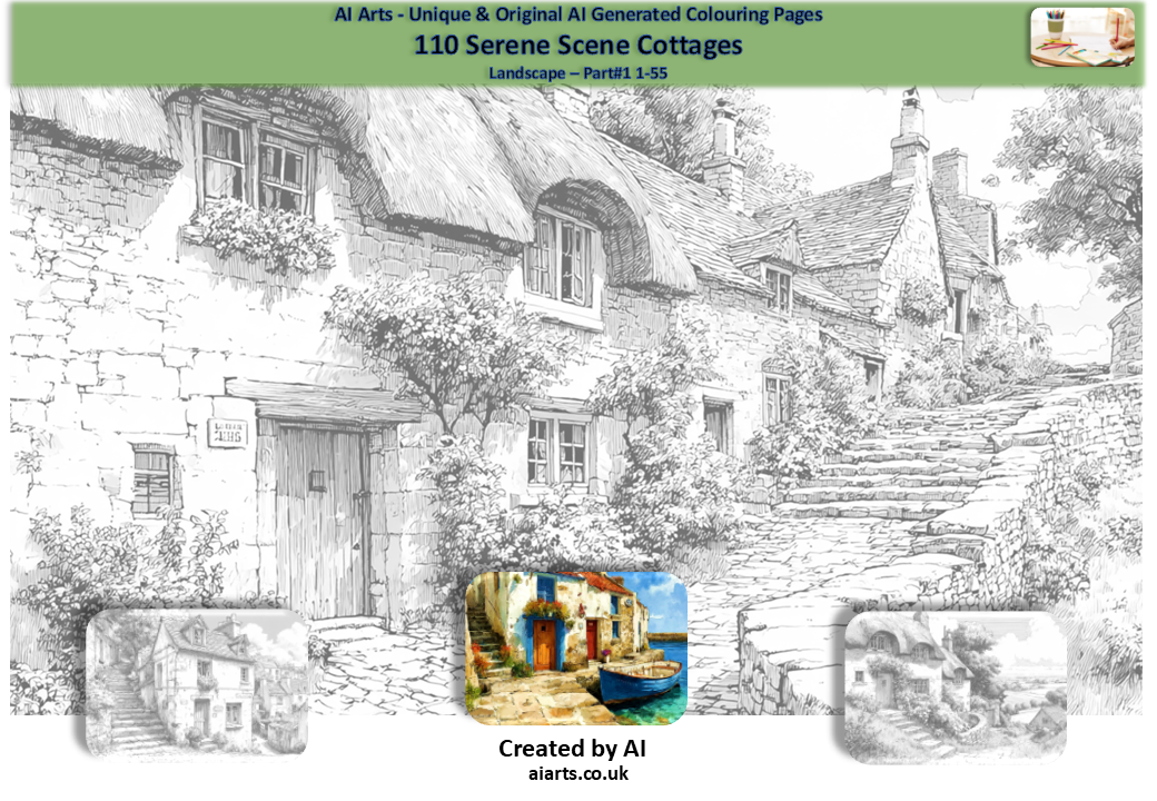 Serene Scene Cottage Colouring Bundle – 110 Pages of Printable Relaxation (PDF) + all 140 png files.