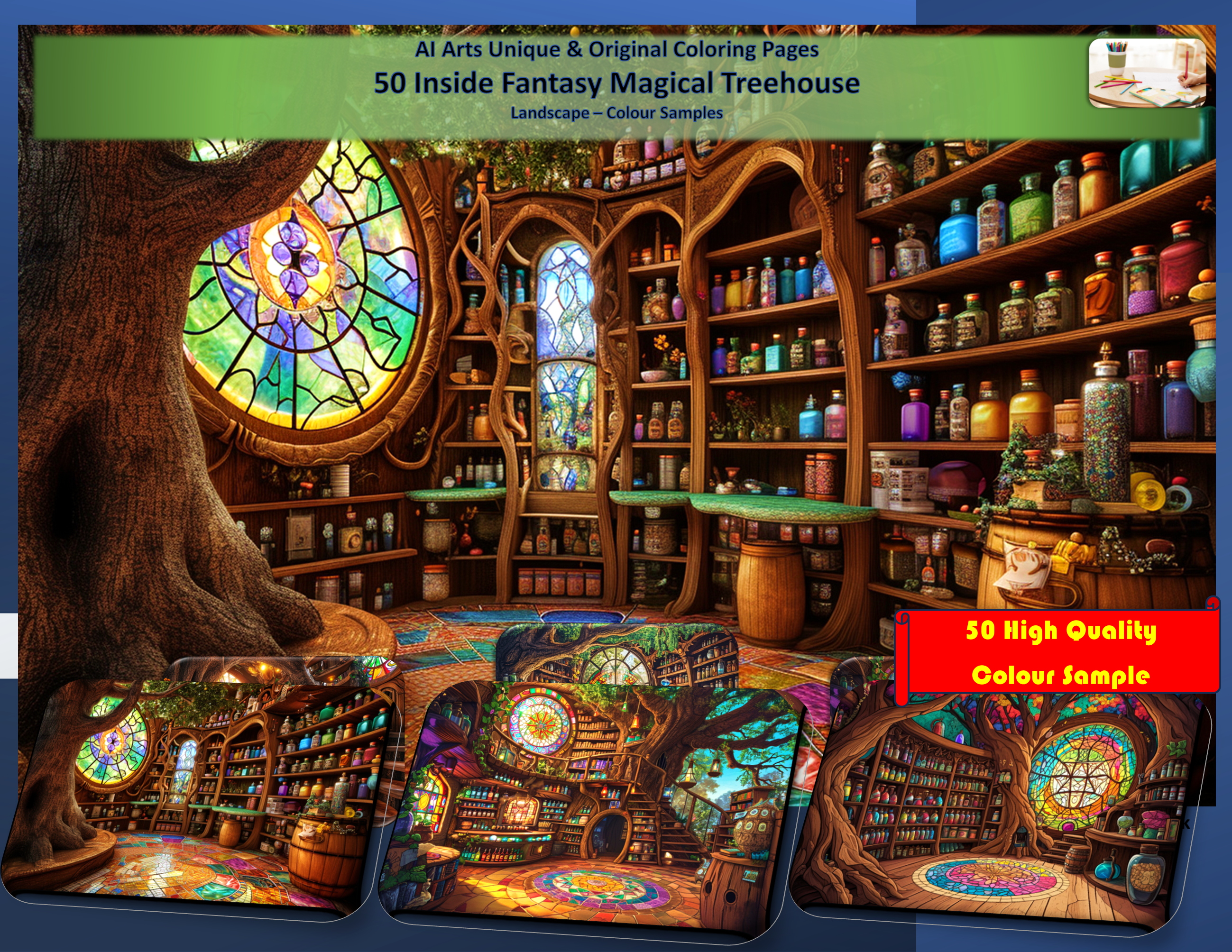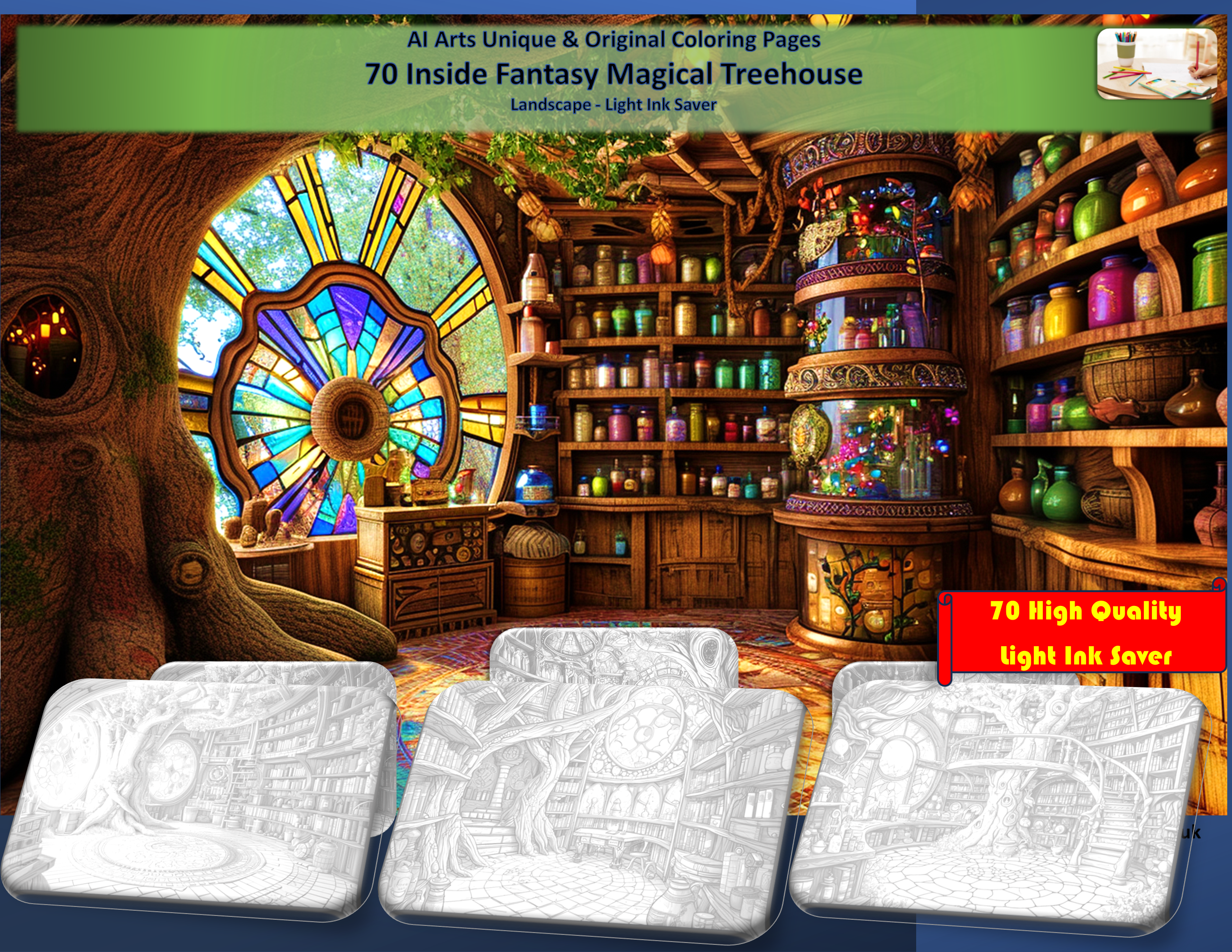 Inside Fantasy Enchanted Magical Tree House, 70 pages plus 50 Color Sample pages, Coloring eBook: Ready to Download, Print, Color & Enjoy!